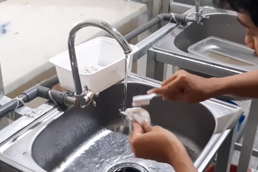 Rinsing using flowing water from the reverse osmosis process with the aim of removing nitrite levels that stick to the swiftlet’s nests.