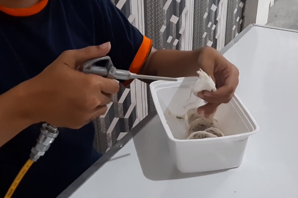 The air from the compressor is used to remove stains and sand that stick to the swiftlet’s nests.
